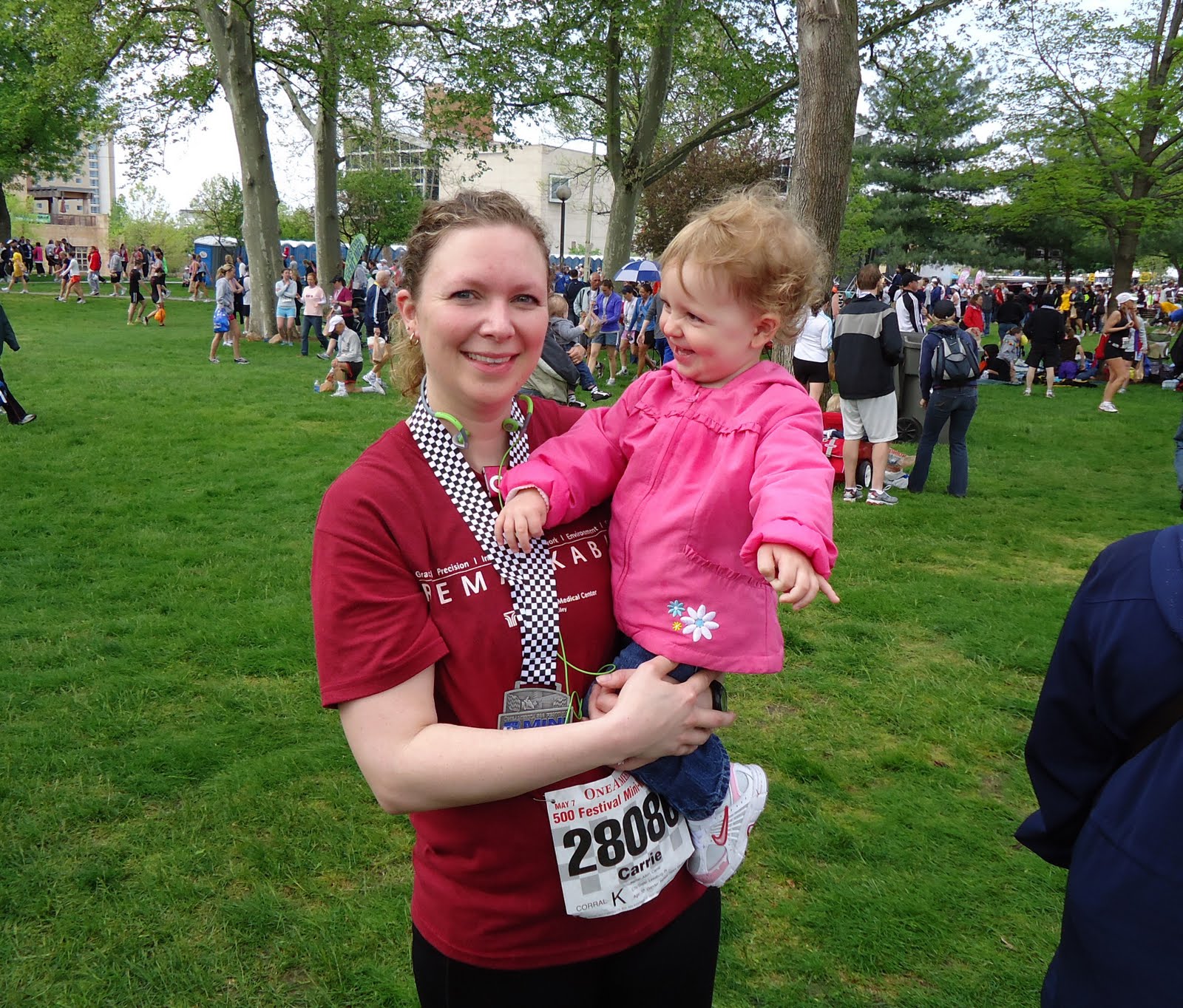 This was my 5th year participating in the Indianapolis Mini Marathon. I love this race! I ran the first two years, walked the year I was pregnant with Hadley and then did a run/walk last year and this year due to lack of training. This year I ran with my friends Primo and Doubie. We had a great time running and chatting it up for 13.1 miles. It was nice to have some company to push through those miles. I only trained up to 6 miles this year, but I'm proud to say that I ran just shy of 11 miles. I love the feeling of accomplishment when you cross that finish line!